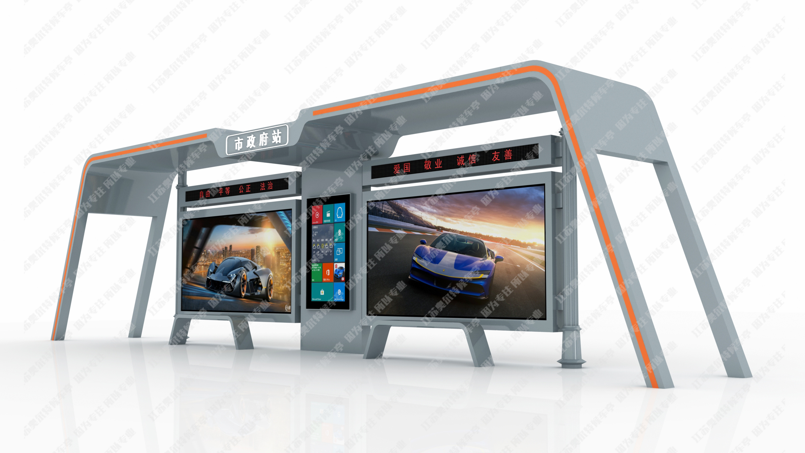 | 候車亭尺寸 | 一大一小尺寸:寬7米,高2.9米,寬1.5米 二大一小尺寸:寬12米,高2.9米,寬1.5米 三大一小尺寸:寬17米,高2.9米,寬1.5米 標準大燈箱尺寸:寬3.65米,高1.8米 標準小燈箱尺寸:寬1.2米,高1.8米 注:可根據客戶需求進行定制,采用模塊化設計,組合方式靈活多變。 |