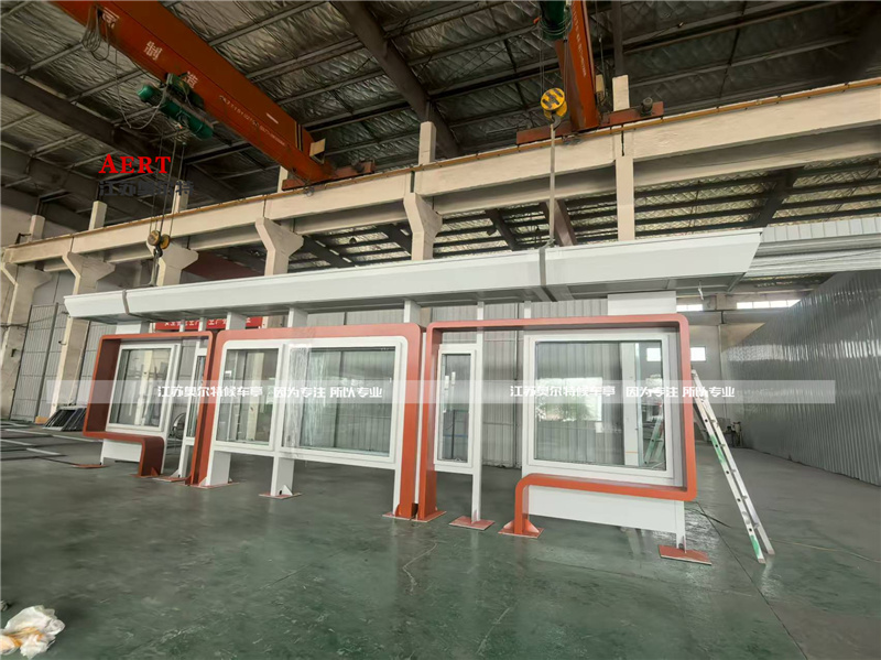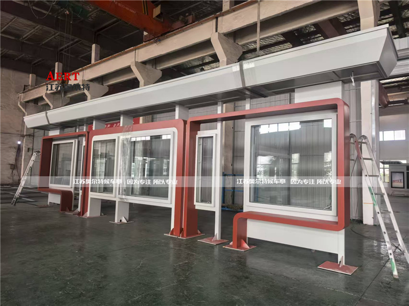 • 外觀設計:候車亭整體采用鍍鋅鋼板,噴涂淺灰色氟碳漆,搭配紅色裝飾和紅色的站點名稱,具有現代風格。