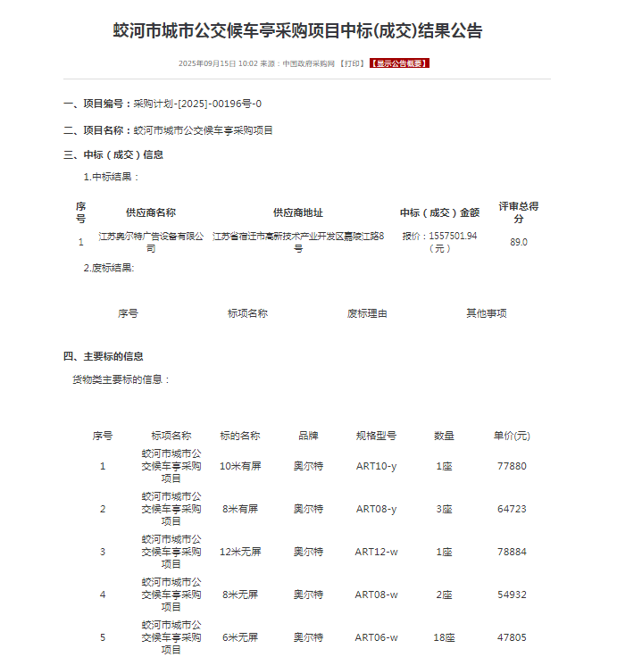 中標喜訊!恭喜「江蘇奧爾特」中標 :蛟河市城市公交候車亭采購項目
